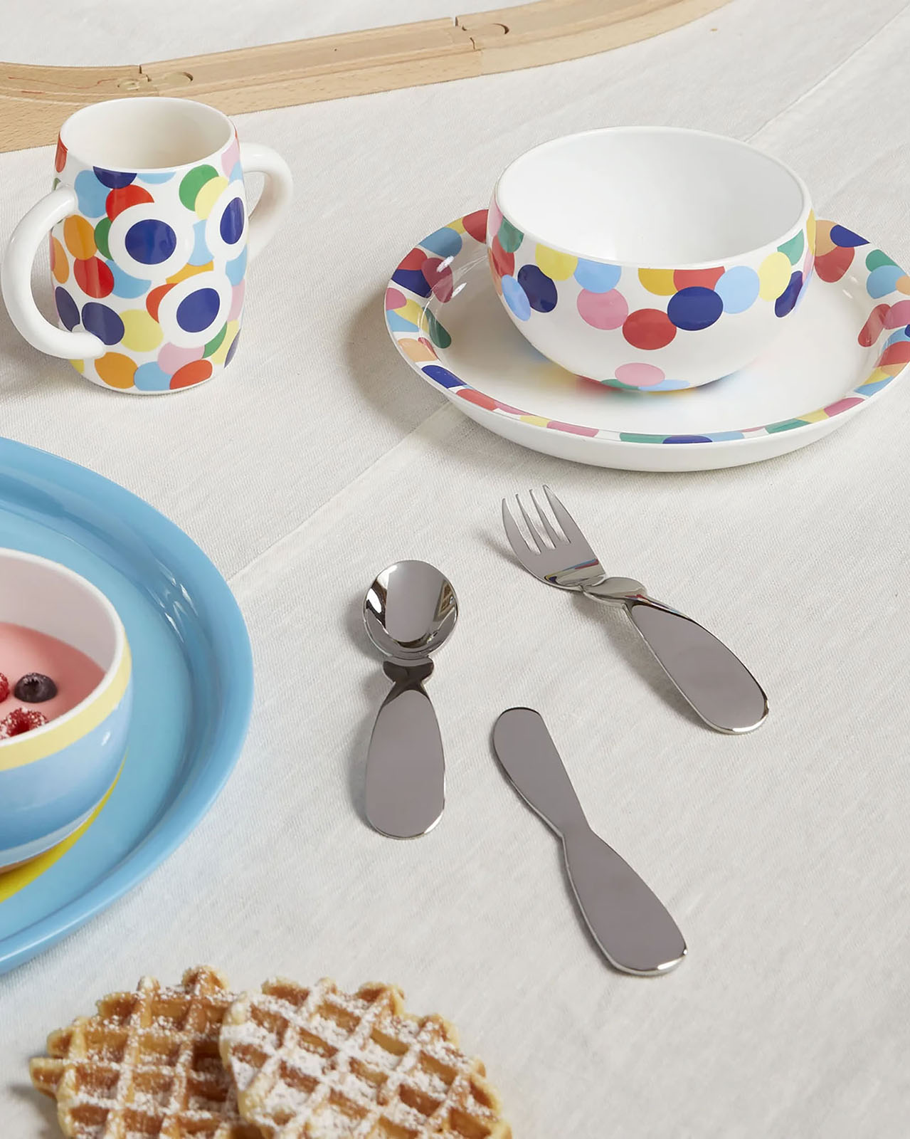 テーブルナイフ、フォーク、スプーンの子供用カトラリーセット。曲線的で流れるようなフォルムのカトラリーは、幼い子供たちの遊び心にあふれたイマジネーションからインスピレーションを得ています。