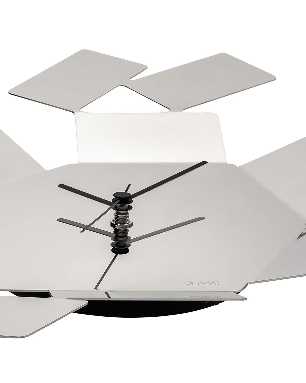 アレッシが得意とする金属加工技術を駆使し、ステンレスのシートから創り出された不規則な六角形のフェイスが特徴です。立体的な構造と空いたスペースから生まれる光と影のダイナミックなコントラストは、単なる時計を超えたアート作品のような存在感を放ちます。 リビングやオフィス、ショップなど、モダンで表現豊かなアクセントを求める空間に、視覚的なインパクトをもたらします。