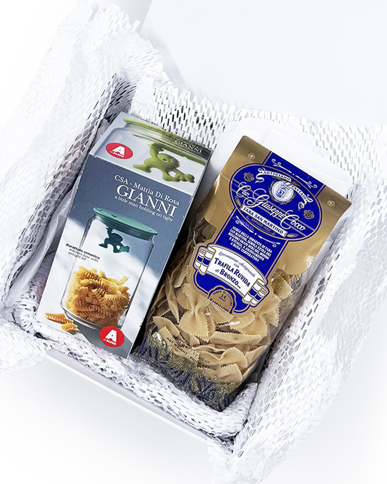 マッティア・ディ・ローザがデザインしたキャニスターと目にもかわいいリボン型パスタのオリジナルギフトセット