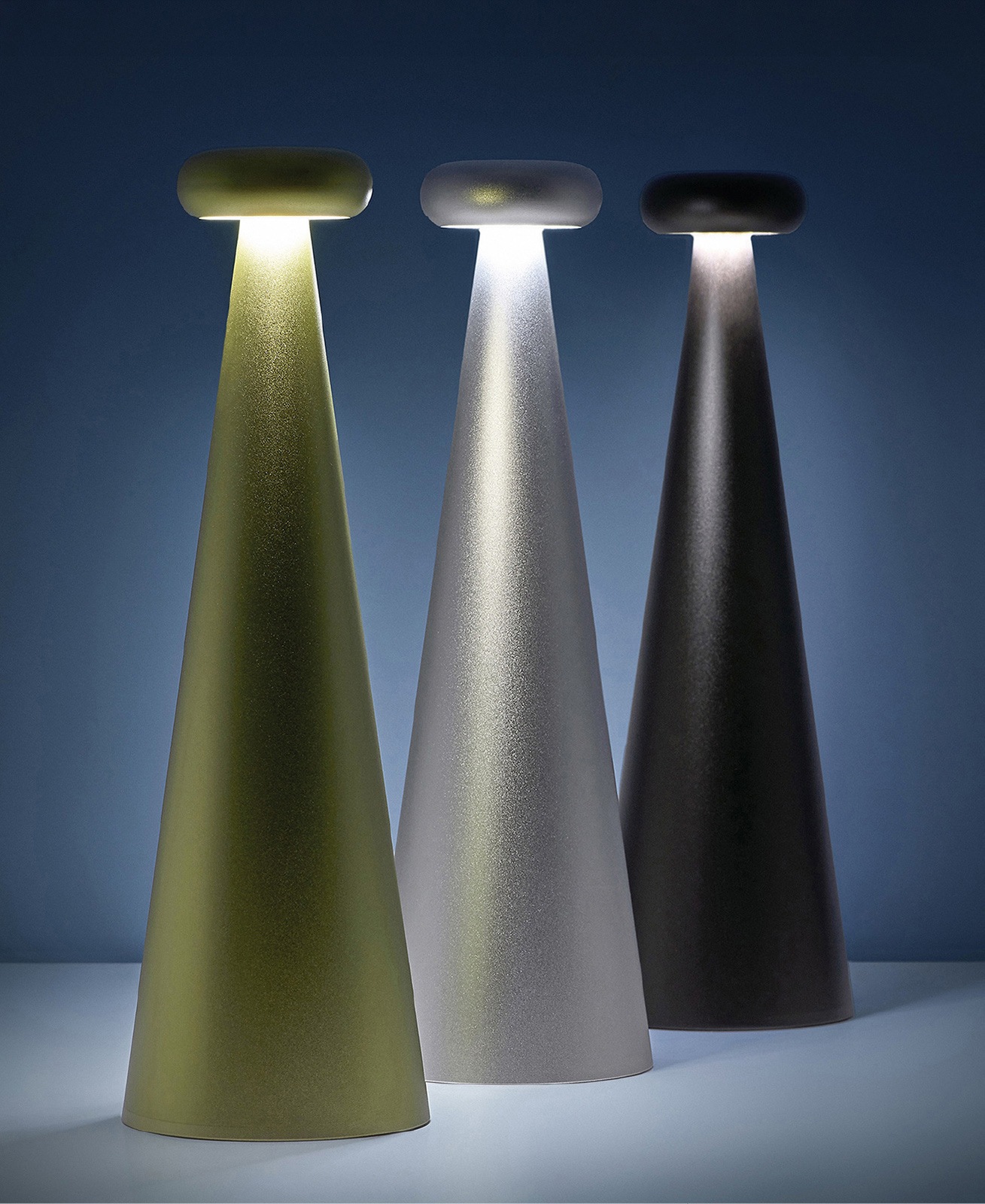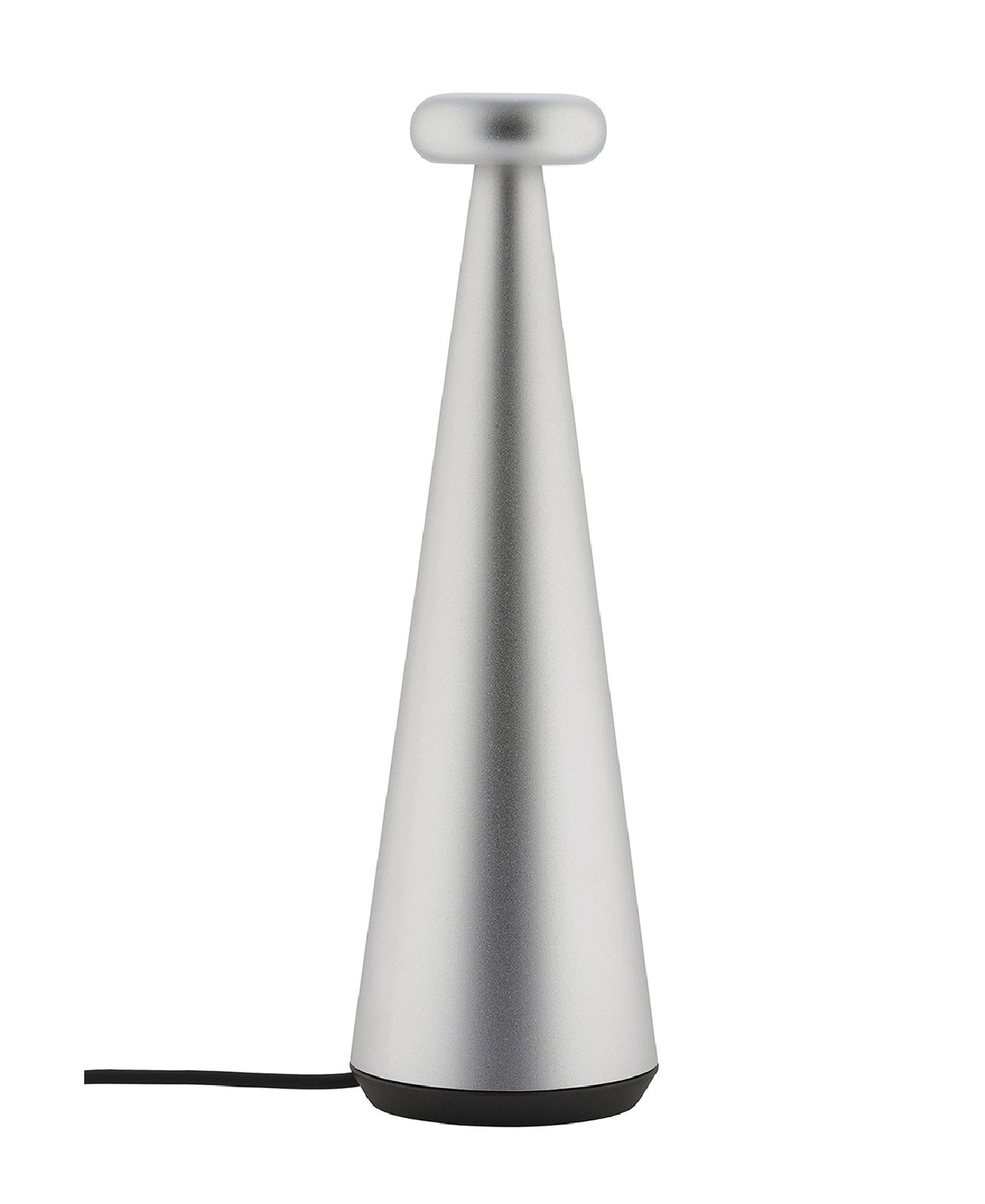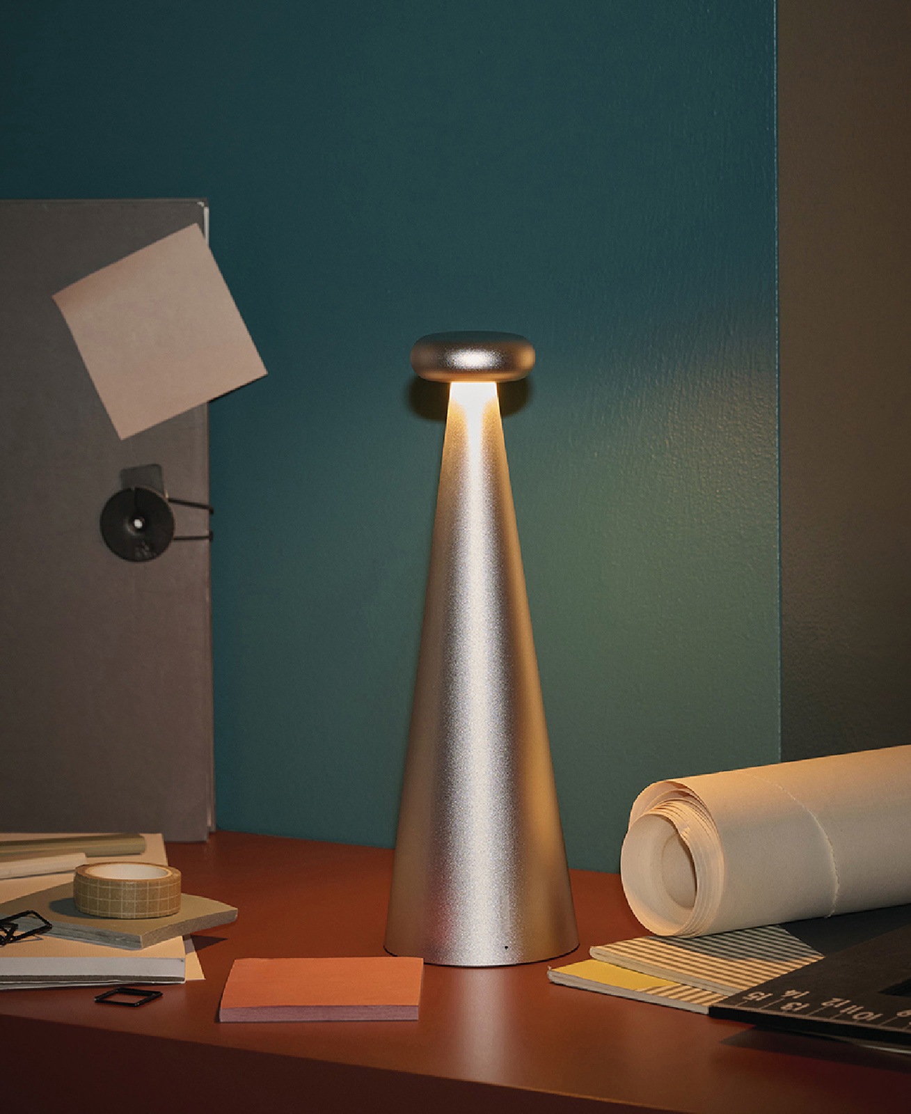 シンプルかつコンセプチュアルなシルエット、そしてアルマイト加工されたアルミニウム製のボディが重厚で上質な質感を演出します。 LEDの光輪を小さくて美しい矮小銀河に見立てたデザインは、ランチのテーブルにも、現代的なデスクにも溶け込みます。